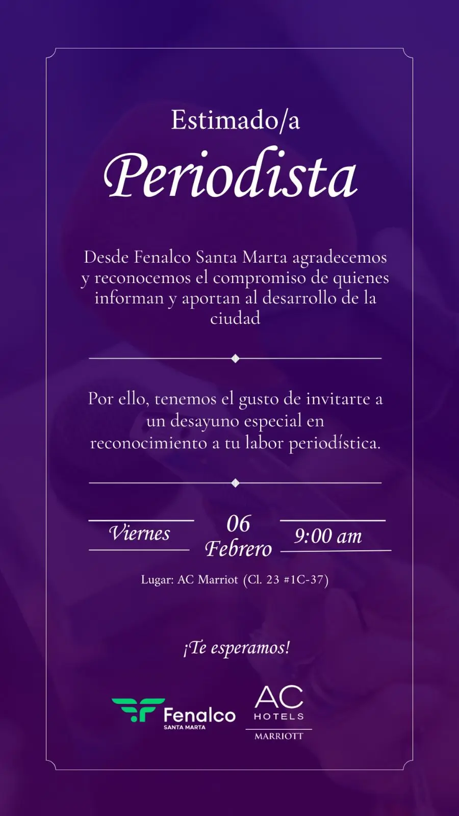 Tenemos el gusto de invitarle a la celebración del Día del Periodista, que se llevará a cabo el jueves 06 de febrero a las 9:00 a.m., en el Hotel AC Marriott, ubicado en la Marina de Santa Marta.