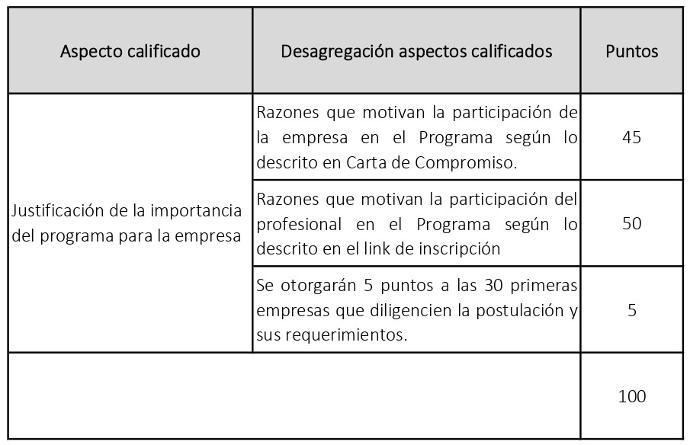 Las empresas postulantes que cumplan con los requisitos mínimos para participar se someterán al proceso de evaluación, a cargo de un Comité Técnico integrado por representantes de la CCB y FENALCO, que se realizará a partir de la información de su postulación y con base en los criterios descritos en la tabla 1.